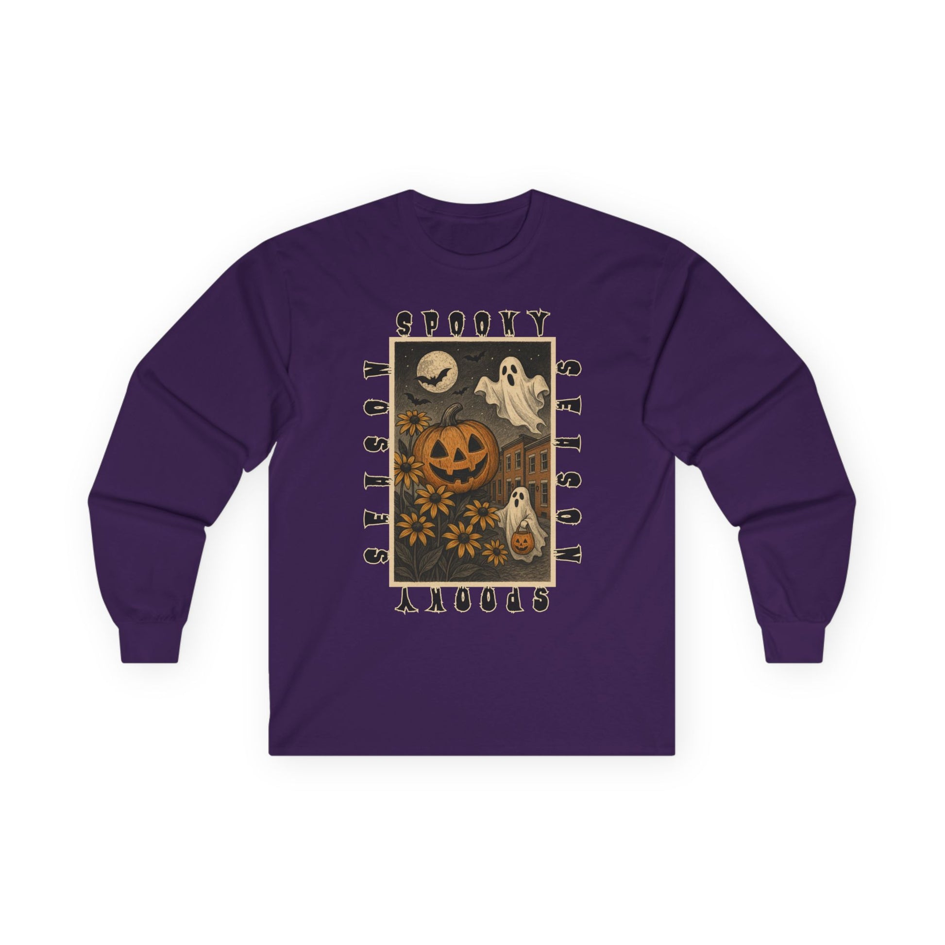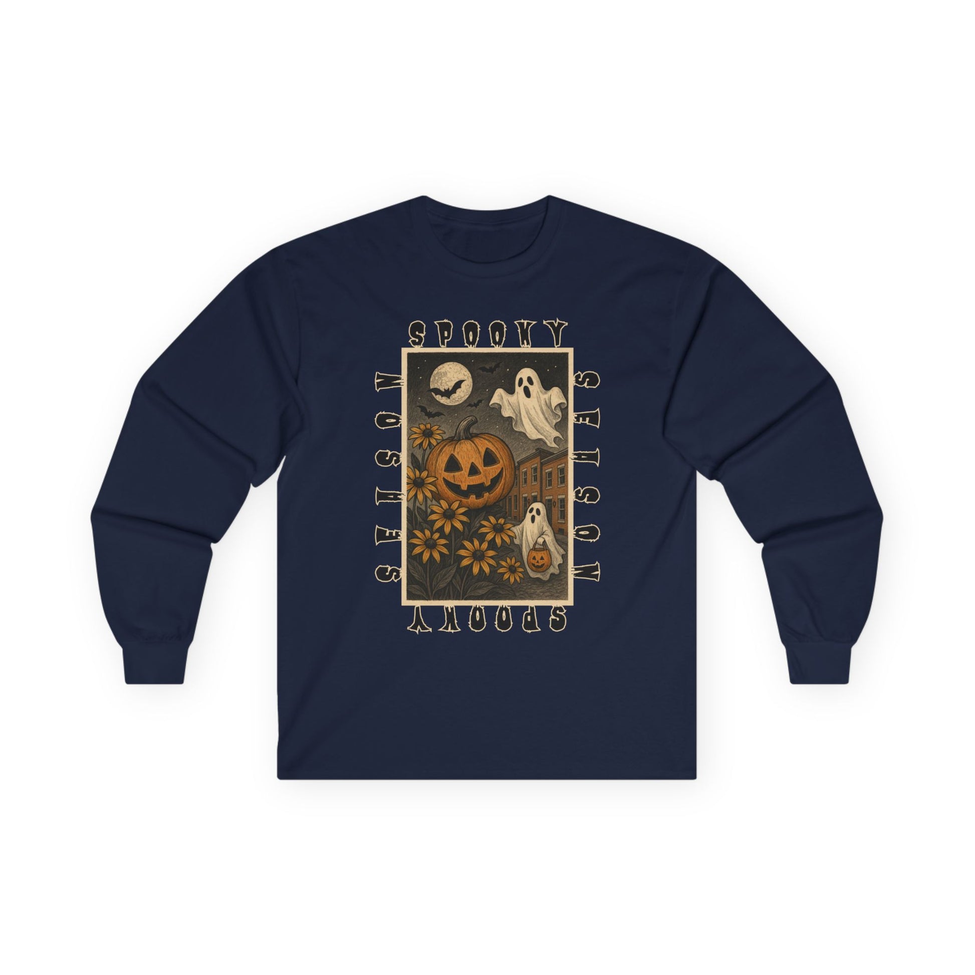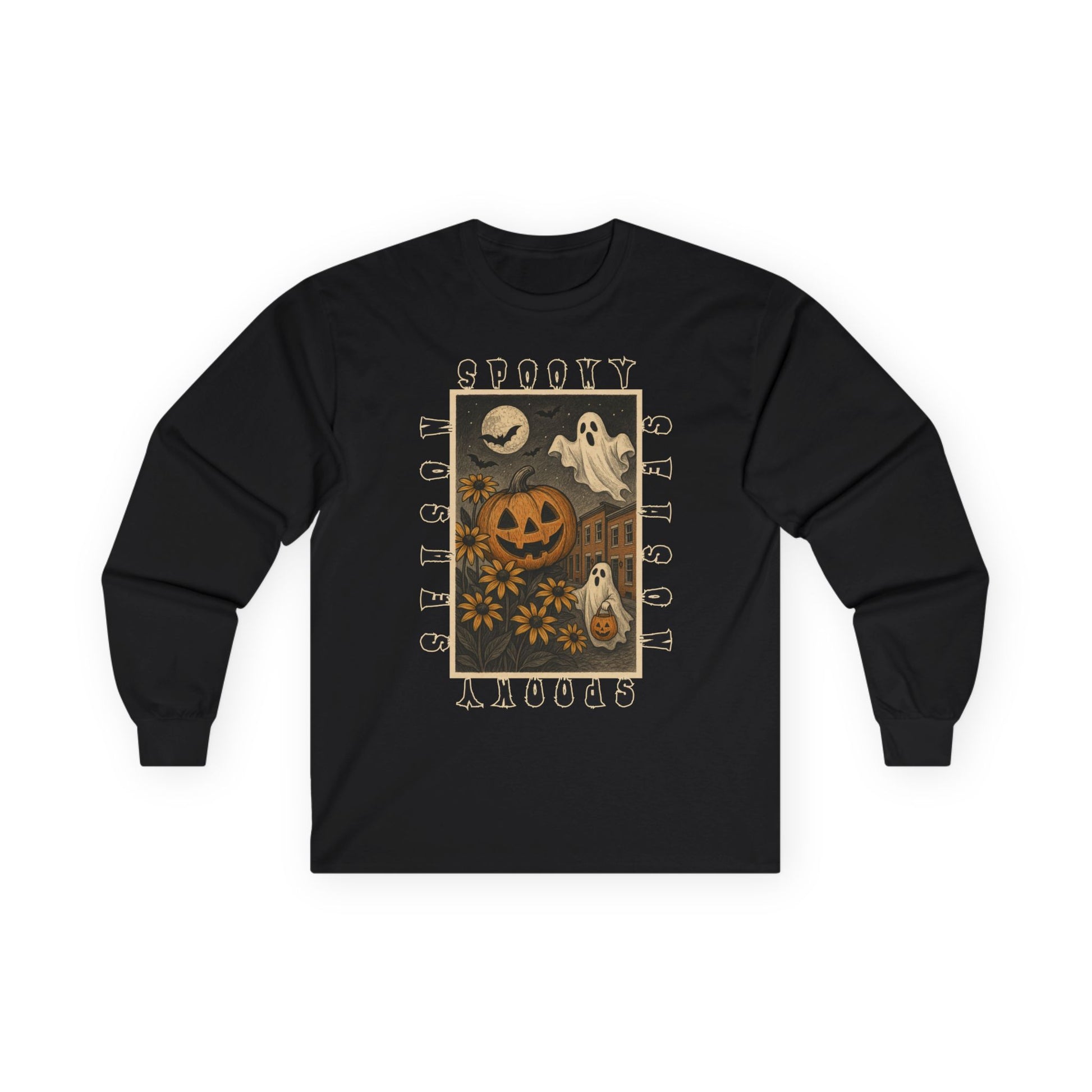 This long-sleeve tee captures the playful spirit of spooky season, featuring a bold illustration of jack-o’-lanterns, Black-Eyed Susans, and friendly ghosts floating above classic Baltimore rowhomes. Surrounded by the words “Spooky Season” in a vintage font, the design blends hometown pride with nostalgic Halloween vibes.