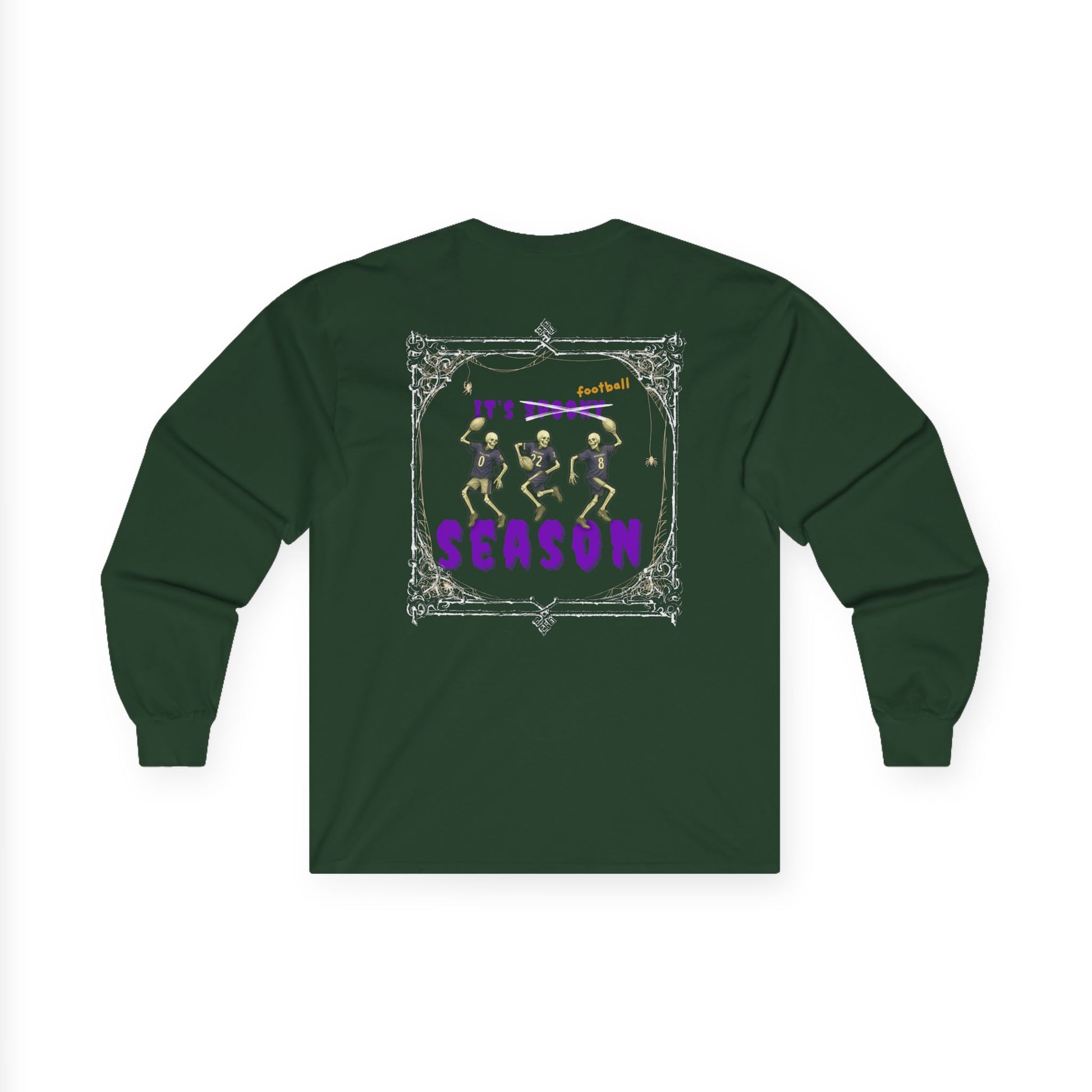 The design features dancing skeletons wearing Ravens-inspired jerseys, framed in cobwebs and gothic borders, with bold lettering that reads “It’s Football Season.” Purple pops against the dark background, making this shirt both eerie and electric—just like Baltimore football in the fall.